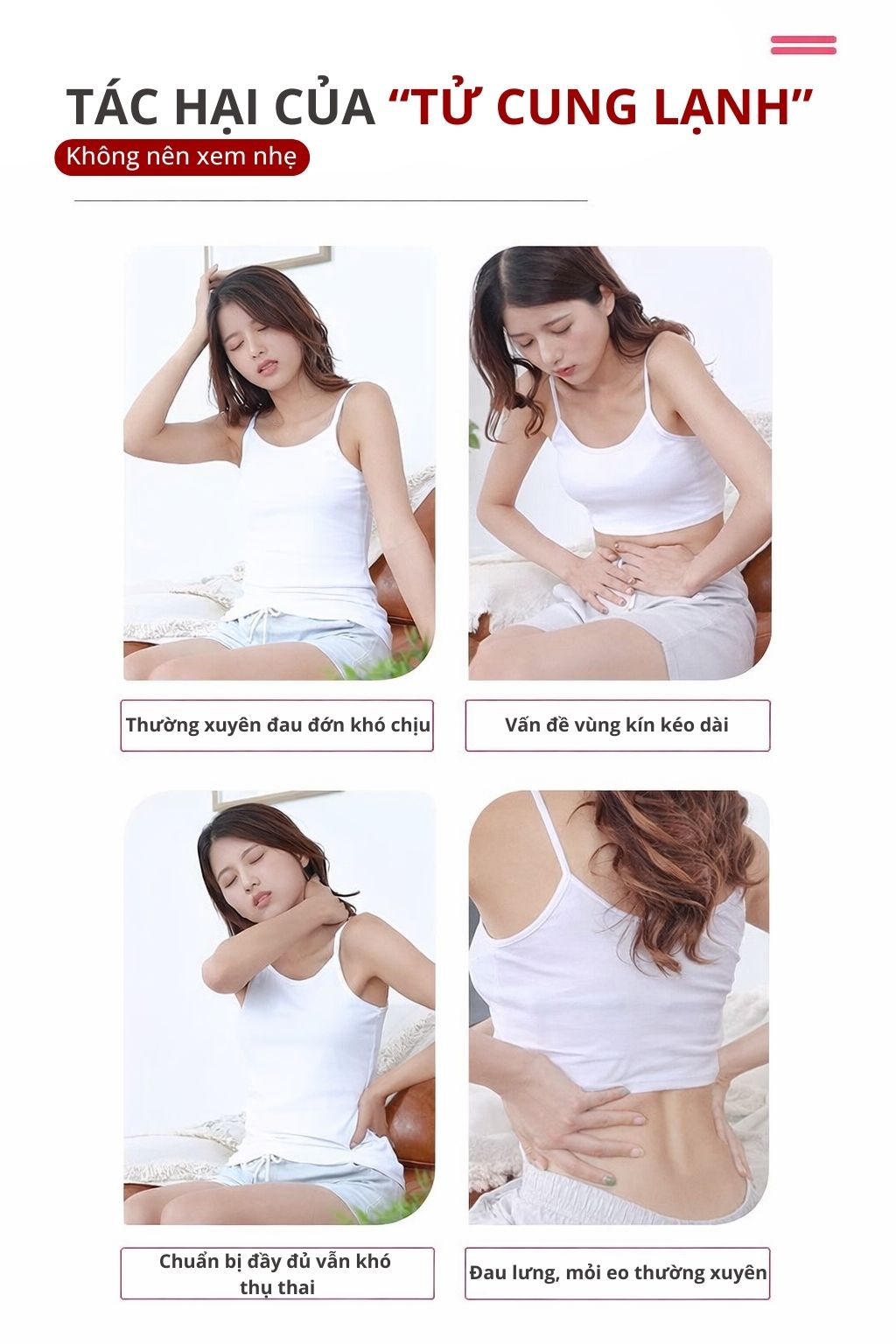 • Các bệnh phụ khoa ở phụ nữ: Đau bụng kinh, kinh nguyệt không đều, viêm nhiễm phụ khoa, lãnh cảm, ẩm ướt, sau sinh đau thắt lưng.