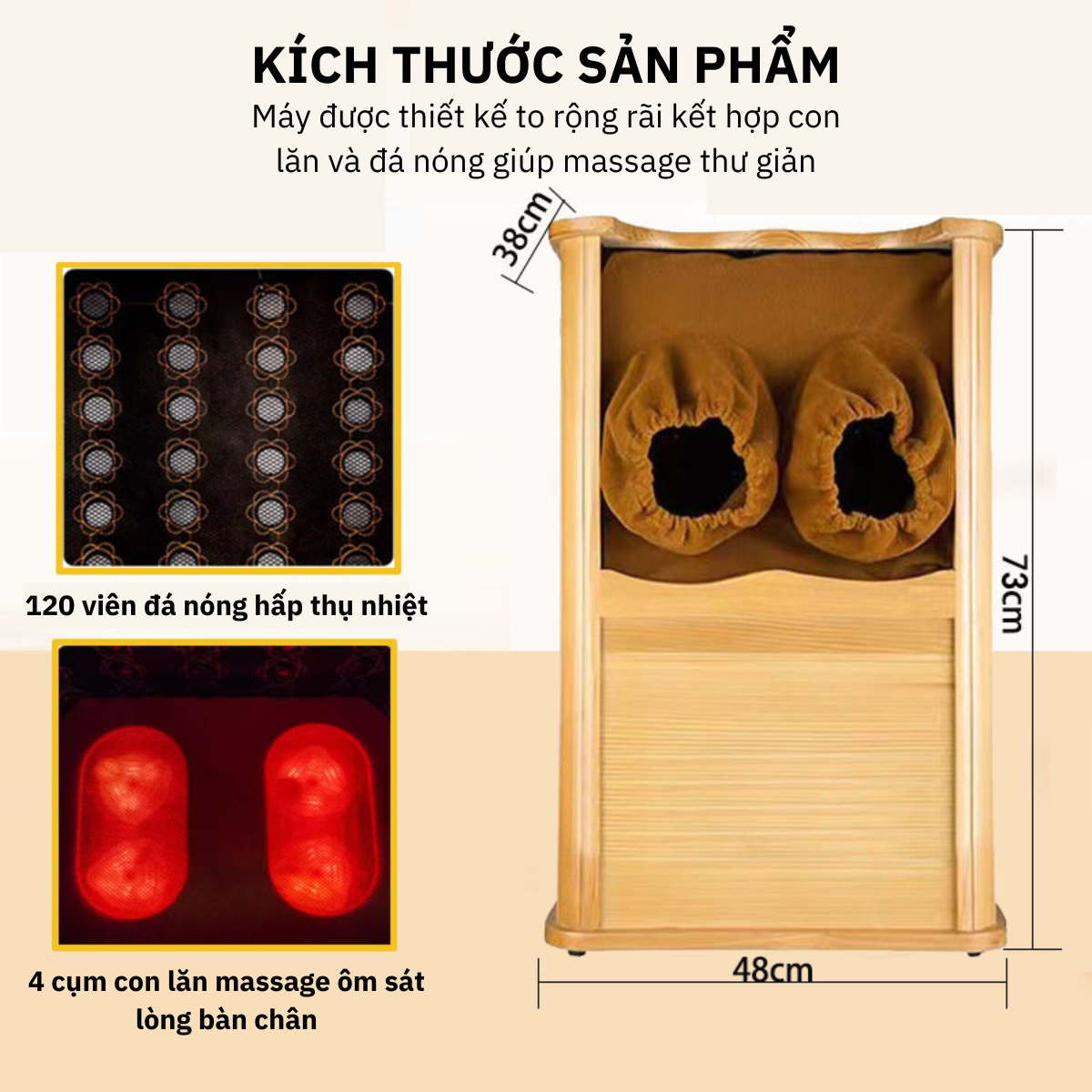 Thùng gỗ đóng chắc chắn k bị ộp ẹp có con lăn với cả đá nóng đặt chân vào vừa ấm ấm bàn chân còn đc mát xa thích lắm luôn