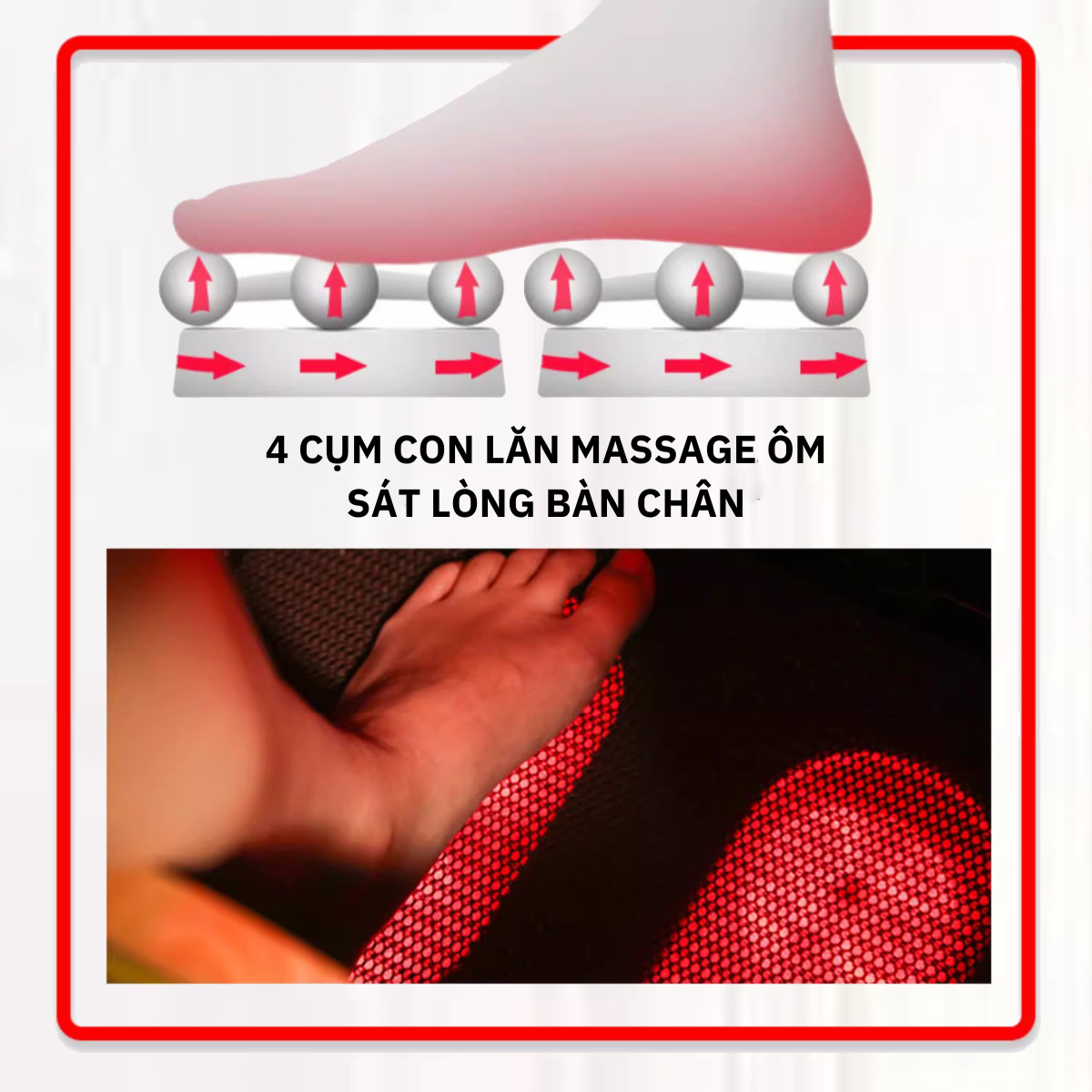 • 4 cụm con lăn massage xoay tròn ôm sát toàn bộ lòng bàn chân.